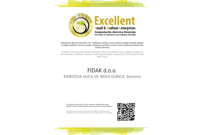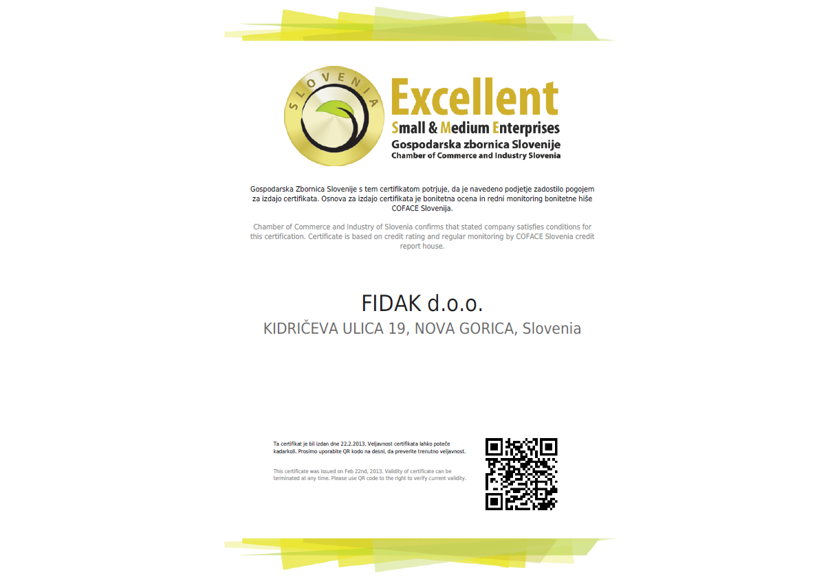 Excellence is confirmed by the certificate of the Chamber of Commerce and Industry of Slovenia